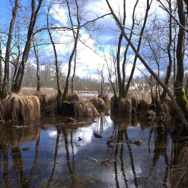 Hier leben große Herden von Rothirschen, die perfekt an das ständige Auf und Ab des Wassers in den Feuchtgebieten angepasst sind. Ihre Kälber lernen bereits in jungen Jahren, wie sie breite Strömungen überqueren und trockenes Land erreichen können. Wildschweine graben geschickt saftige Süßwassermuscheln aus dem Schlamm von Pfützen. Im Frühling, wenn die ersten Regenfälle die Wiesen mit Wasser durchtränken, tauchen unzählige Moorfrösche auf, um Tümpel und Pfützen zu besetzen, die sich im Sonnenschein schnell erwärmen. Die Männchen nehmen einen leuchtend blauen Farbton an, um potenzielle Partnerinnen zu beeindrucken. Spezialisierte Vogelarten wie der Wiedehopf und der Ziegenmelker ziehen ihre Jungen in sorgfältig ausgewählten Lebensräumen auf. Der Wiedehopf siedelt sich in sonnenbeschienenen Lichtungen an, während der Ziegenmelker den Schatten des Waldes bevorzugt. Kormorane übernehmen ganze Inseln für ihre Kolonien und unzählige Reiherarten bauen ihre Nester in Gebieten, wo Sümpfe, Kanäle und Seen eine Fülle an Fischen bieten.